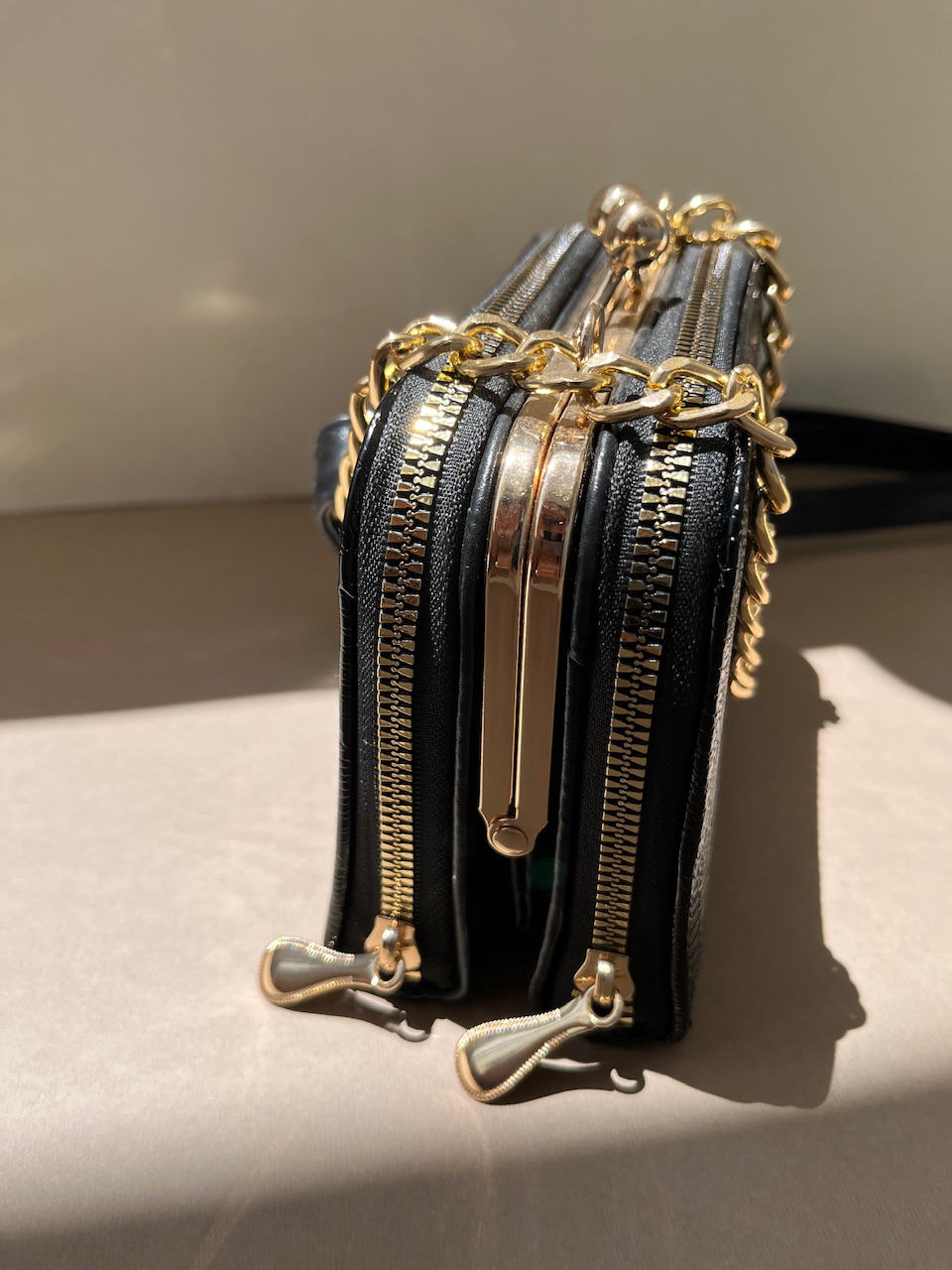 این مدل جز دسته های مجلسی و روز مره قرار میگیره ظاهری شیک و جذاب داره یراق الات طلایی رنگ به کیف جلوه میده سایز نسبتا کوچک برخی از مدل های گوشی داخلش قرار میگیره بند قابل تنظیم داره سه جای مجزا و کاربردی داره